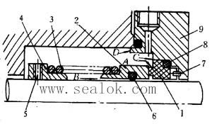 常用机械密封结构如图29.7-1所示。由静止环(静环)1、旋转环(动环)2、弹性元件3、弹簧座4、紧定螺钉5、旋转环辅助密封圈6和静止环辅助密封圈8等元件组成,防转销7固定在压盖9上以防止静止环转动。旋转环和静止环往往还可根据它们是否具有轴向补偿能力而称为补偿环或非补偿还。